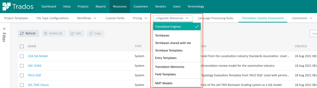 As such, we have now consolidated Translation Engines, Translation Memories, Termbases and NMT models into a Linguistic Resources sub-menu.