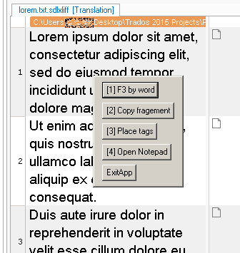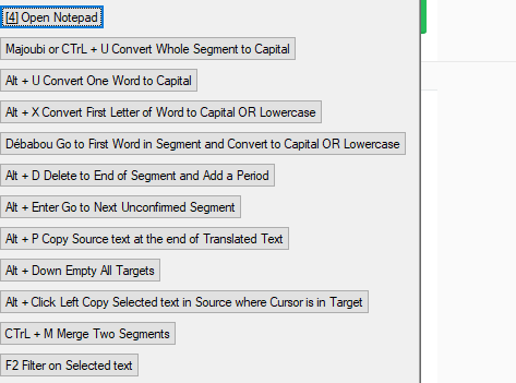 It would seem that while everyone has a set of his favourite scripts, these scripts tend to have all separate shortcuts to activate them, and sooner or later you're going to run out of potential shortcuts. It may also be hard to remember all the shortcuts. So what I was thinking what might be a good idea is to create a right-click menu in Trados that you can use to run any number of scripts. You can then save all your scripts in a separate location, edit the menu script to point to the scripts, and then use the menu instead of each individual script individually.