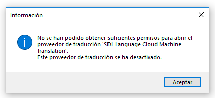 thank youError message in Trados Studio stating insufficient permissions to open 'SDL Language Cloud Machine Translation' provider, which has been deactivated.