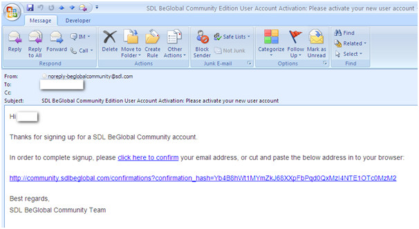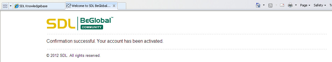 If you did not receive the confirmation email, make sure you add noreply-beglobalcommunity@sdl.com as a trusted source in your email program before you contact SDL Support.