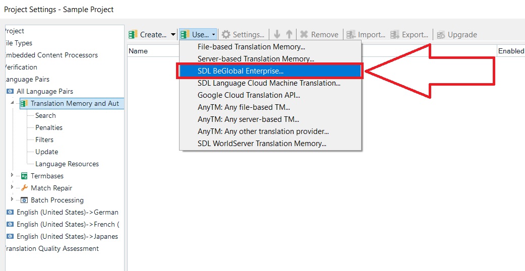 1. Go to Project Settings -> Translation Memory and Automated Translation-> Use - BeGlobal Enterprise