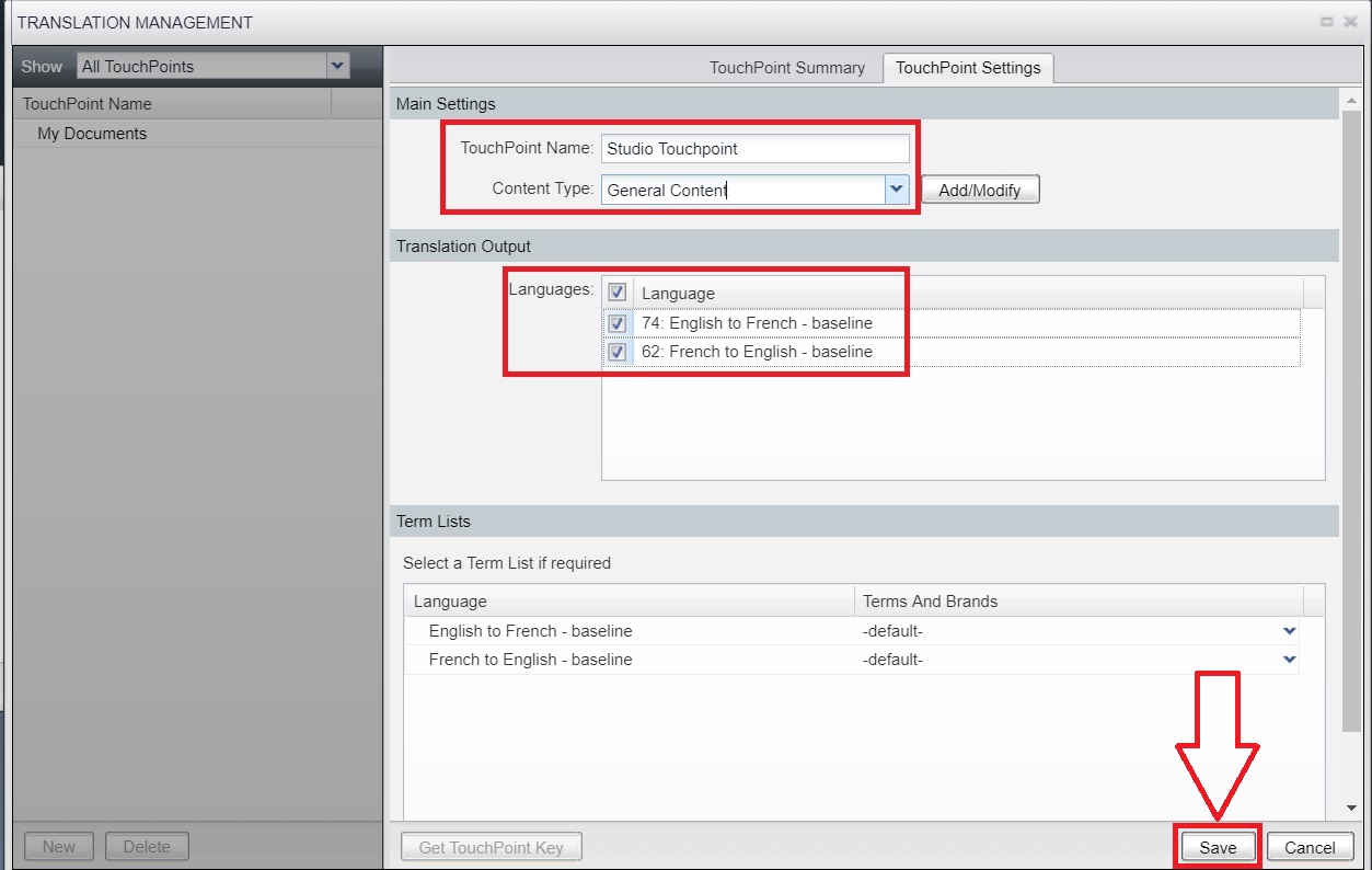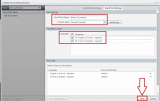 5. Select a TouchPoint Name, and Content Type - General Content, activate the Language Pairs you want for this TouchPoint.