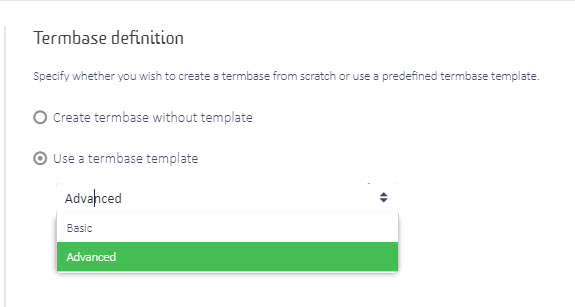 Screenshot of Trados Studio's Termbase definition page showing options to create termbase without template or use a termbase template with 'Advanced' selected.