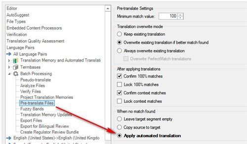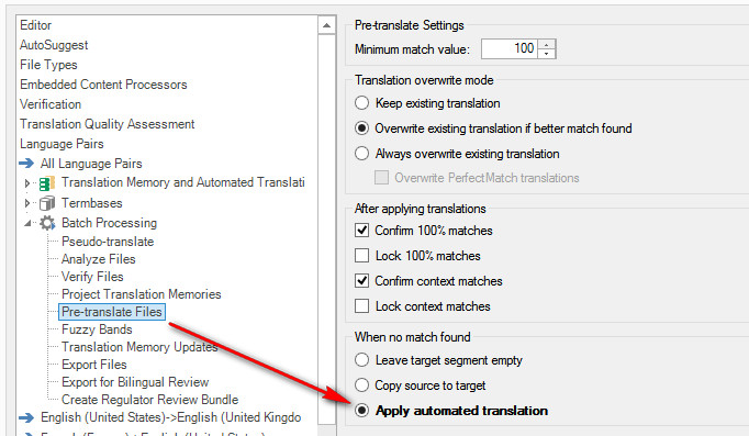 On your technical issue... this is just a setting which you need to apply so that MT is applied during pre-translation if there are no TM matches. So do this: