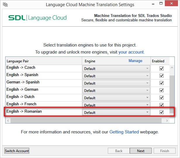 Now when I add SDL Language Cloud I have any engines that are available to me listed and the Romanian one is there: