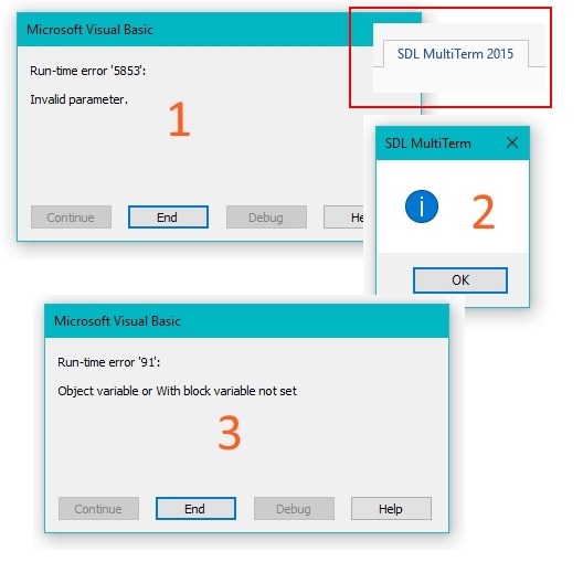 If you add it manually in Word going to Options / Add-Ins / Manage: Word Add-Ins (and then "Templates and Add-Ins" dialog box) from this folder "C:\Program Files (x86)\SDL\SDL MultiTerm\MultiTerm14\Templates" the next thing you get is the error message 1 (see attached picture). Once you continue and add a Multiterm termbase, the next thing you see is the blank message 2 and immediately error message 3. In other words, it doesn't work.
