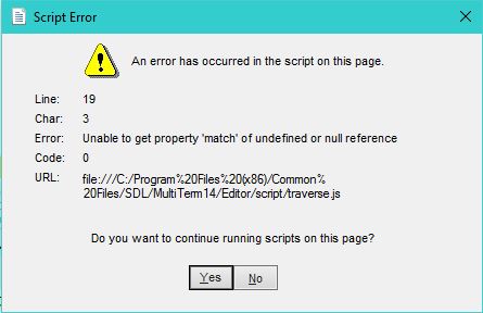 I'm getting this error from a JavaScript script named traverse.js located at C:\Program Files (x86)\Common Files\SDL\MultiTerm14\Editor\script. It's sort of an "intermittent" problem. Now, for instance, I was able to finish adding a term but a few minutes ago I was getting this error message, even within Multiterm Desktop 2017. Thanks for looking at this issue.