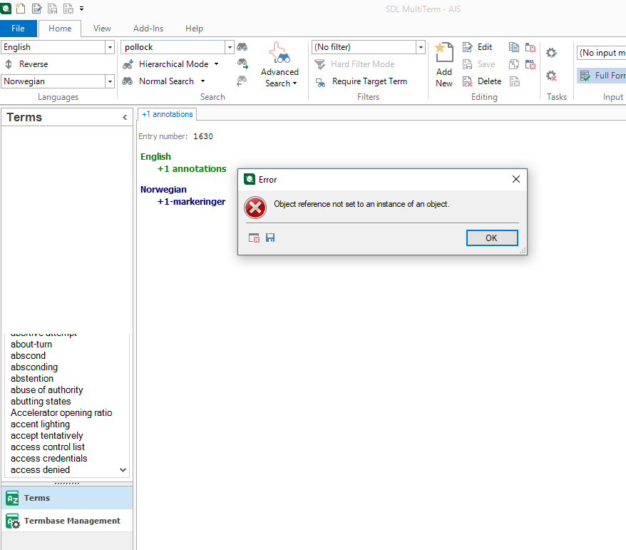 I'm not able to search in Multiterm. When I try, I get the error "Object reference not set to an instance of an object". As you can see, part of the Terms window is "hidden" (white).