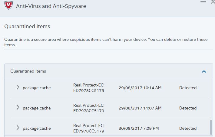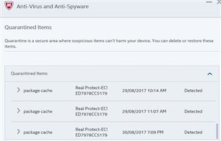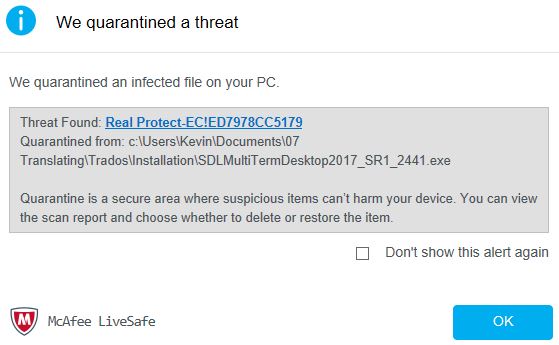 During my first failed attempt at installation I received a message from McAfee regarding the quarantine of an infected file: "Threat found: Real Protect-EC!ED7978CC5179",