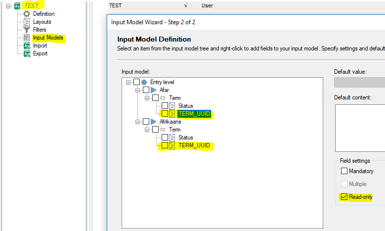 Although I am now able to select an input model (or use the Activated model) within "Default layout" display, the "Read only" rule is ignored, i.e. I am able to add and edit a Read only field.