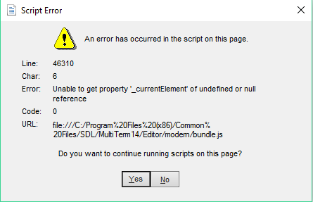 Script Error dialog box showing an error has occurred in the script on this page, with details about the line, character, error, code, and file URL.