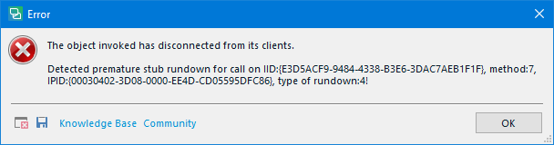 "The object invoked has disconnected from its clients.Detected premature stub rundown for call on IID:, method:7,"
