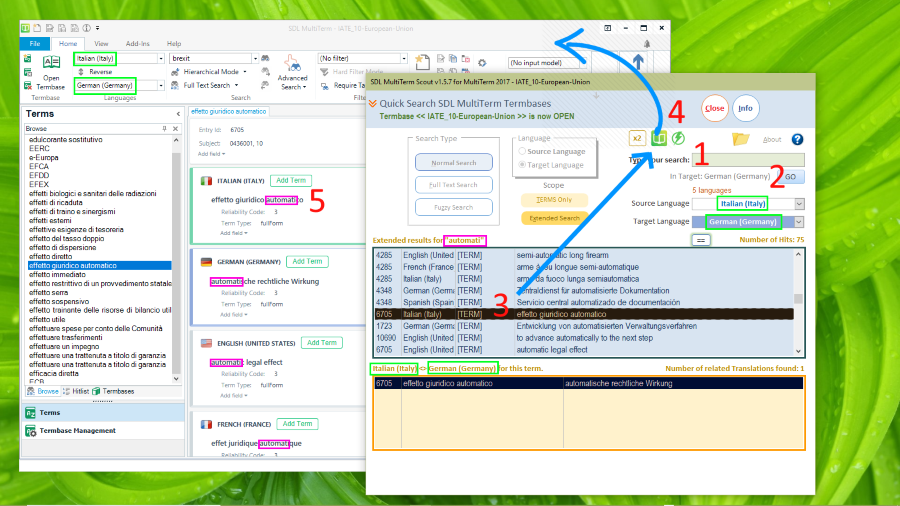 • Last, but not least, it can help you connect directly with SDL MultiTerm Desktop with that specific term and that specific language, in tandem. That is, you click on the MultiTerm icon (4) and you'll see immediately SDL MultiTerm Desktop working, locating that term and that language for you.