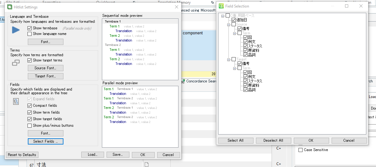 I've done some editing to the field hierarchy in a termbase and now whatever I do I cannot get my hitlist settings to display the fields in the term recognition window.