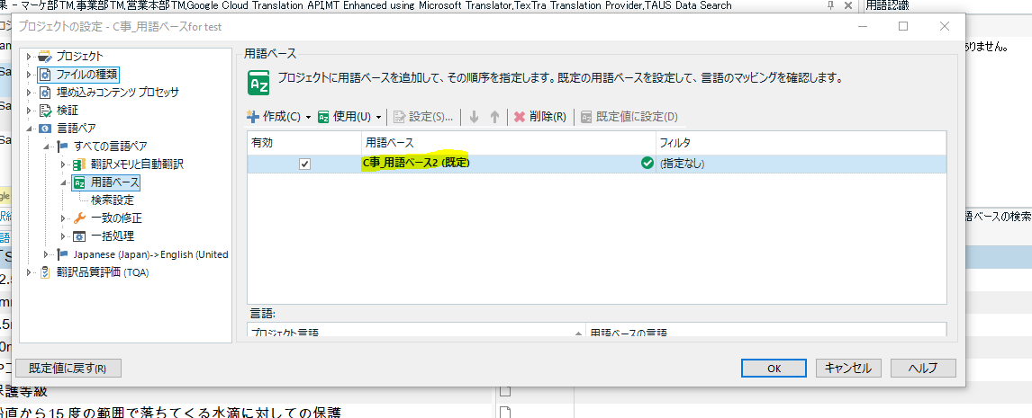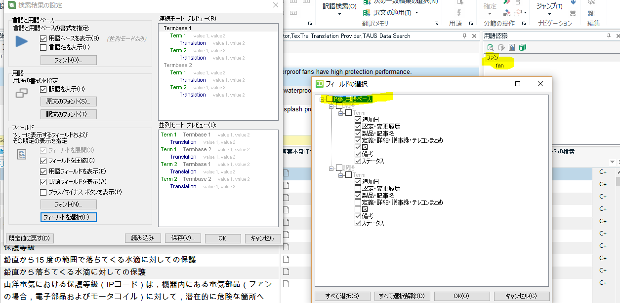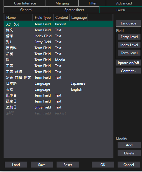 Trados Studio glossary converter field settings showing fields set to entry level and term level with Japanese content.