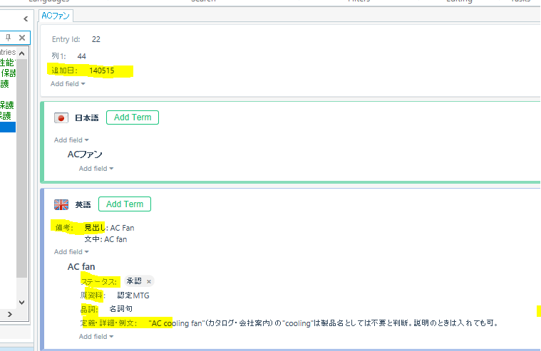 Trados Studio MultiTerm window displaying extracted fields from an Excel spreadsheet with highlighted term 'AC fan' and no visible errors.