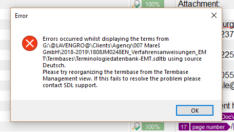 Error message in Trados Studio stating 'Errors occurred whilst displaying the terms from GmbHLAVENGRQ@ClientsAgency07Mars' and advising to reorganize the term base or contact SDL support.