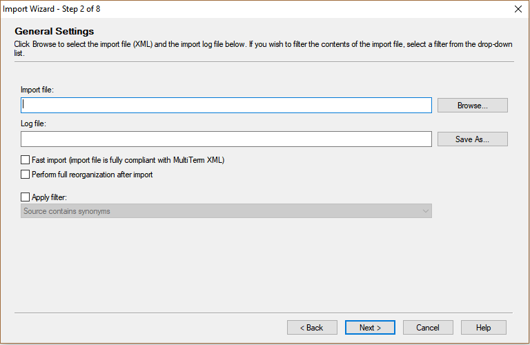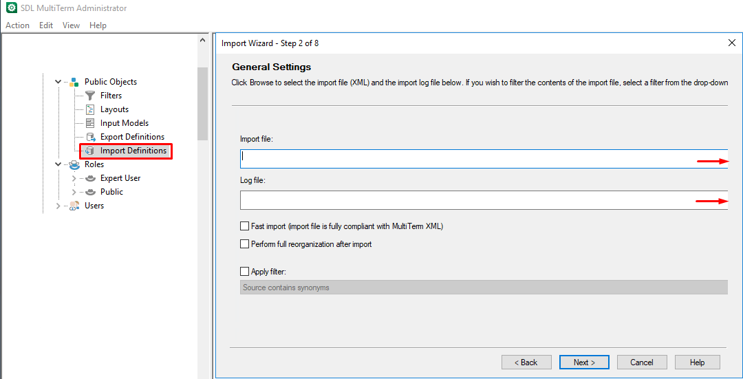 Screenshot of SDL Multiterm Administrator 'Import Wizard' window displayed correctly with 'Next', 'Back', 'Cancel', and 'Help' buttons visible at the bottom.