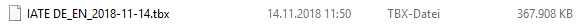 File explorer showing the selected TBX file named 'IATE DE_EN_2018-11-14.tbx' with a size of 367.909 KB.