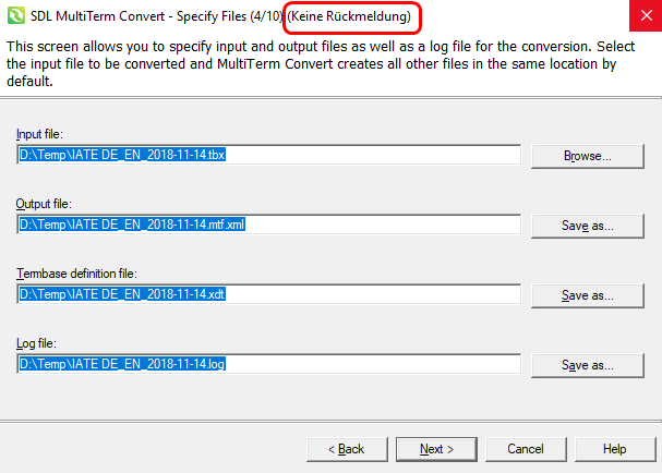 SDL MultiTerm Convert window showing no response with the message '(Keine R ckmeldung)' indicating the program is not responding after clicking 'Next'.