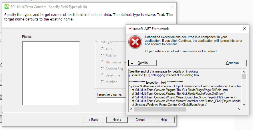 Clicking on "Next >" renders the paths blue and freezes the pop-up window (no response):