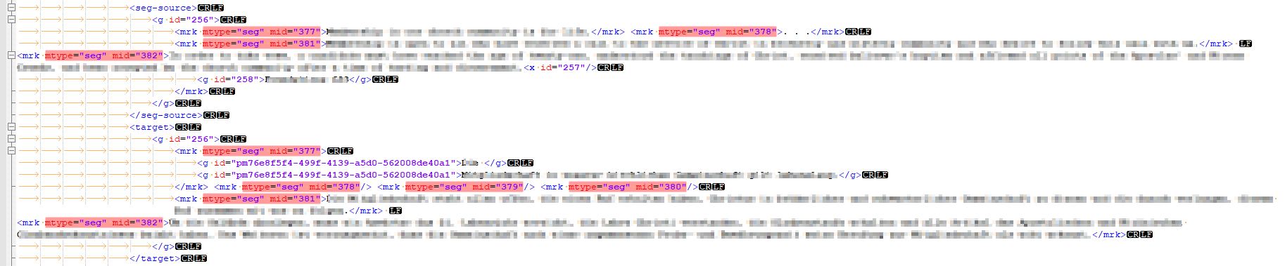 Here's my question: Does anyone have a Regex that finds this kind of mismatch between source and target segment? It does take quite some time to find the broken part of the file...