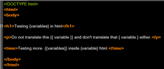 <p>Do not translate this {{ variable }} and don't translate that { variable } either.</p>