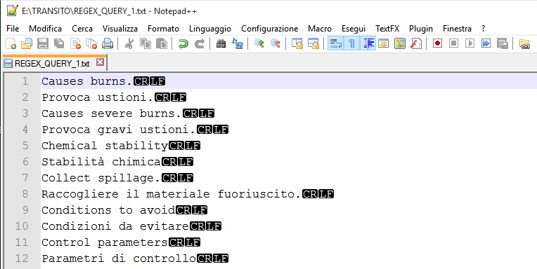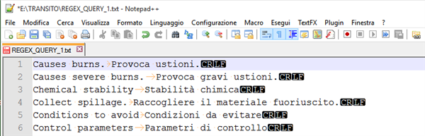 - Can anyone suggest a "Find and replace" Regex function (provided it is possible) to transform the [CR][LF] at the end of the English (source) string to a [TAB], leaving untouched the [CR][LF] at the end of the Italian (target) segment in the whole document?