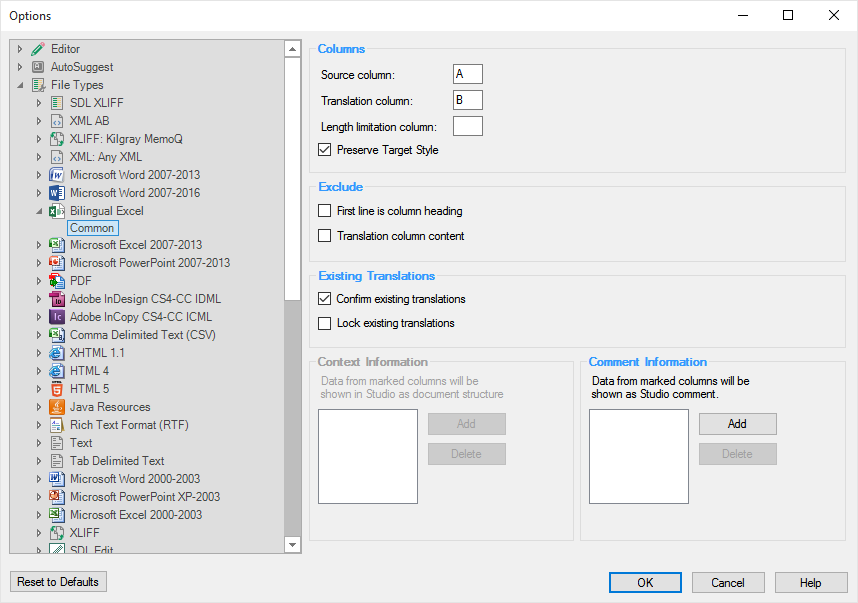 This will allow me to generate a *.csv (*.txt) file to import in a MS Excel sheet with, say, source text in column "A" and target text in column "B" to process it in SDL Studio using the "Bilingual Excel" file filter as follows: