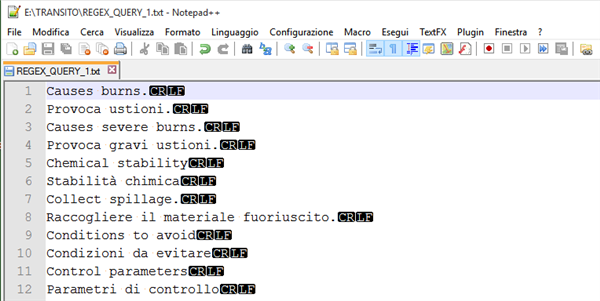 Suppose to have a plain text file like this one (Notepad++ 6.8.6) with the English (source) string on one line and the Italian (target) string in the subsequent line (this latter, sometimes, is a blank segment):