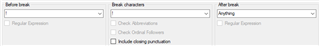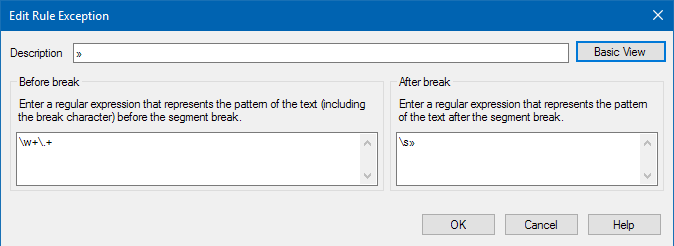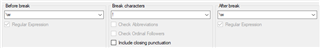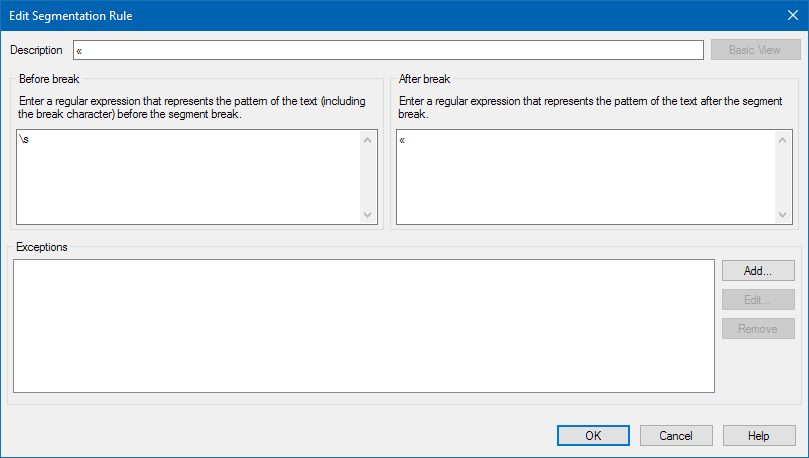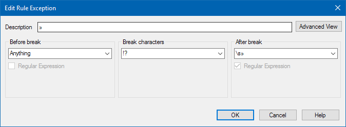 I work in a French/English environment where we are translating in both directions and, in order to maximize leverage of our respective memories, wish to respect our respective styles. Our house style for French is to insert a space after opening French quotation marks («) and before the closing ones (»). I cannot figure out how to make the Studio 2015 break after the closing quotation mark where it is separated from a full stop, question mark or exclamation point by a space. I am new to regular expressions, but I tried to force Studio to include a closing quotation mark preceded by a space using (?:\p{Zs}\p{Pe})|[\s] in the After break space. I tried with and without Include closing punctuation, but it did not work. Any suggestions?