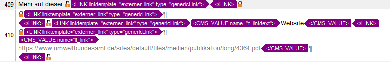 <?xml version="1.0" encoding="UTF-8" standalone="no"?> <root> <FORMAT name="p"/> <FORMAT name="p">Some text. Mehr auf dieser <LINK linktemplate="externer_link" type="genericLink"><![CDATA[PFRFnothingtotranslatehereSFDGERT=]]> <CMS_VALUE name="lt_linktext">Website</CMS_VALUE> <CMS_VALUE name="lt_link">www.umweltbundesamt.de/</CMS_VALUE> </LINK>. </FORMAT> </root>