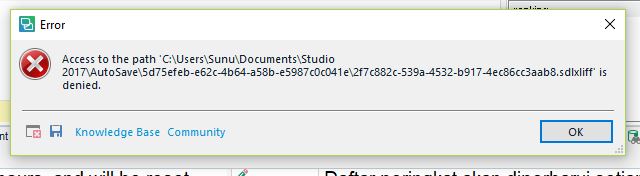 I just installed Studio 2017 yesterday and everything went perfect. Suddenly today I received an error "Access to the path 'C\Users\Sunu\Documents\Studio 2017\AutoSave\.....sdlxliff' is denied. The error message suddenly popped-up and everytime I try to save my work.