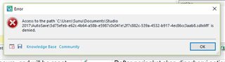 The problem looks as though it's most likely to be caused by the use of the OneDrive folder, which Studio unfortunately tries to use for the AutoSave feature.  This issue is pretty well documented in these forums as it is something we need to address, and if you'd picked a more recent post instead of one from so long ago you might have found the solution.