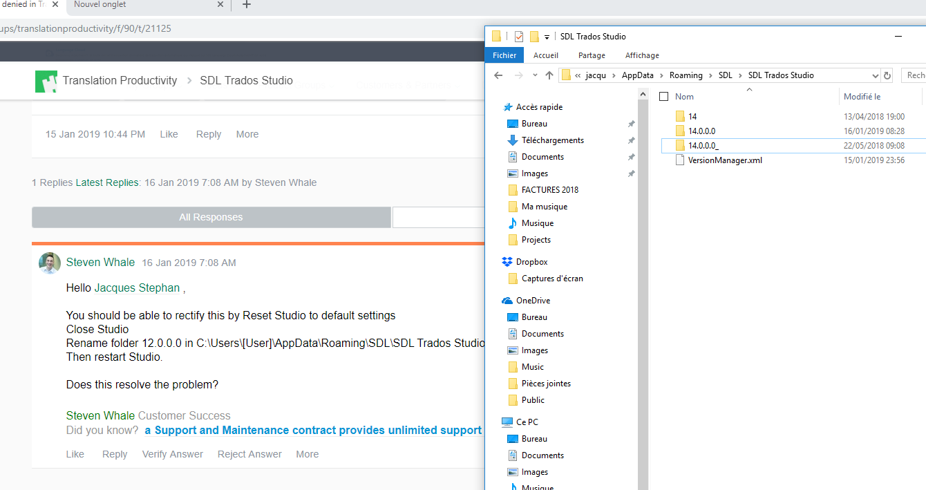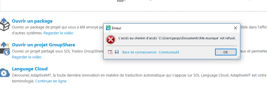 Package opening denied in Trados; when clicking on the package that was on my Desk, I got the following message "Access to access path C:\Users\jacqu\Documents\Ma musique is denied." This started this afternoon, all of a sudden.