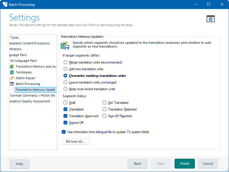 - have tried the solutions from some of the threads here. The setting in the Batch Processing/Translation memory update field are also correct (ie the same as here: