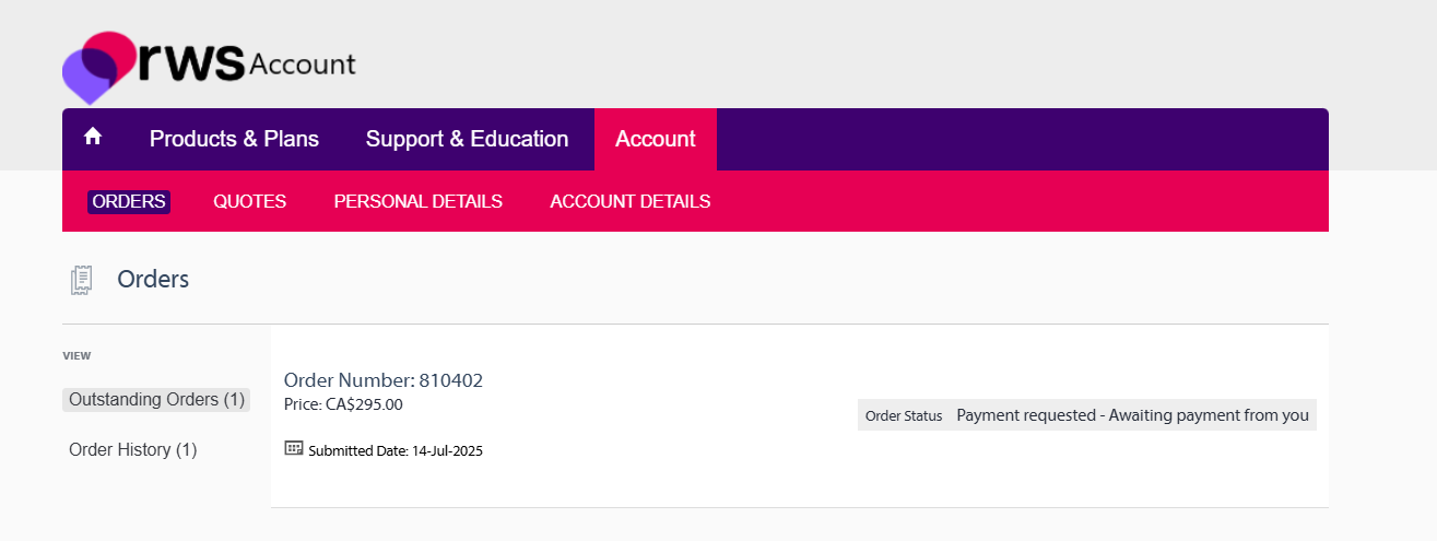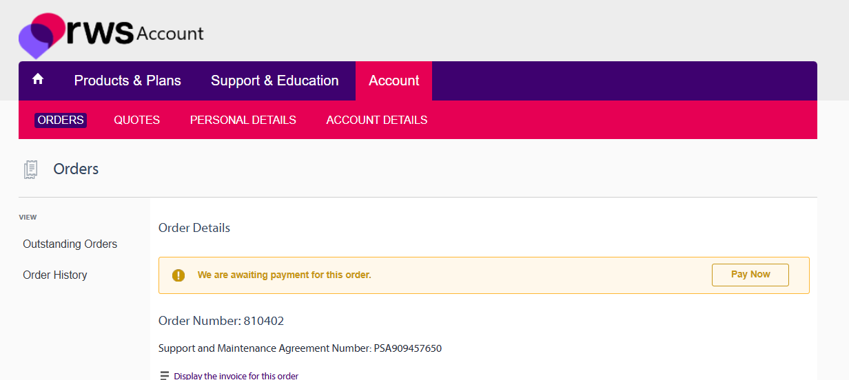 In cases where your SMA is close to its renewal date and expected renewal invoice has not been received yet, please login to your RWS account, go to the ACCOUNT section and click on the ORDERS tab. Your renewal invoice will be displayed there: