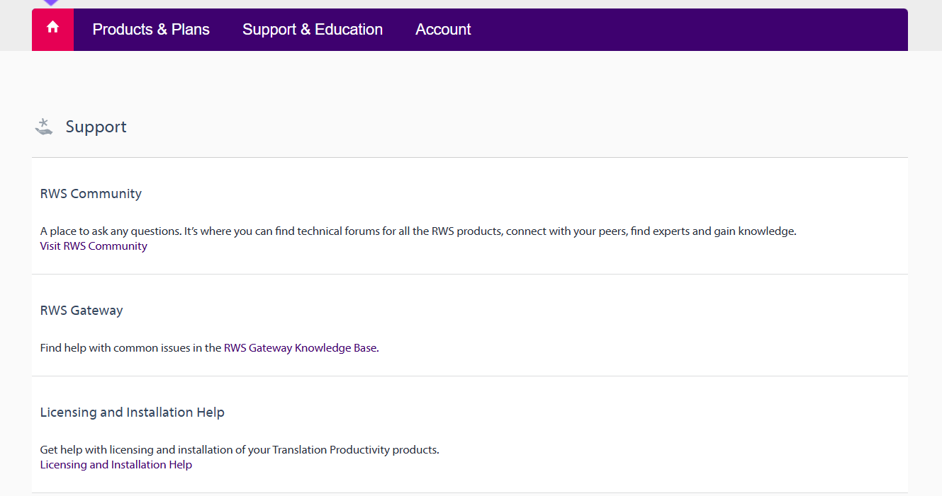 - If your support contract is currently inactive AND you have the latest edition of Trados software in your RWS account then the following screen will appear: