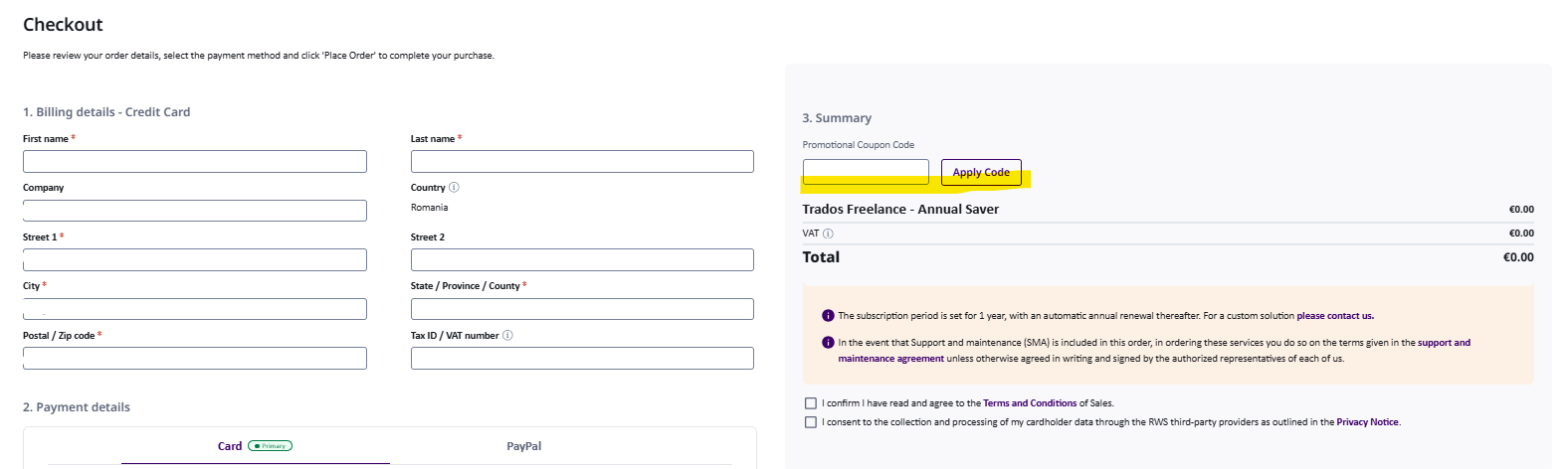 On the checkout page, enter all the required details. If you have a coupon code, apply it here, please make sure to fill in all fields marked with an asterisk (*).
