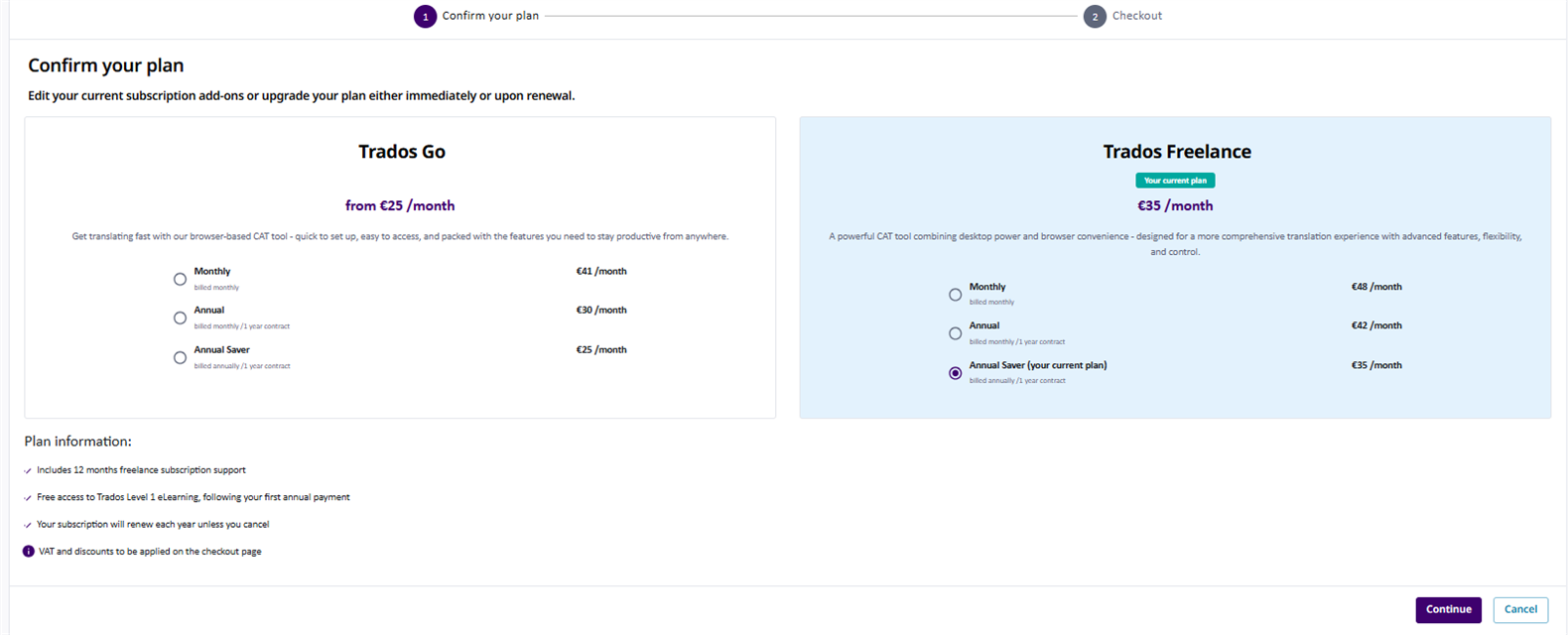 5. You’ll then be redirected to the Trados Subscription page where you can confirm your subscription plan.