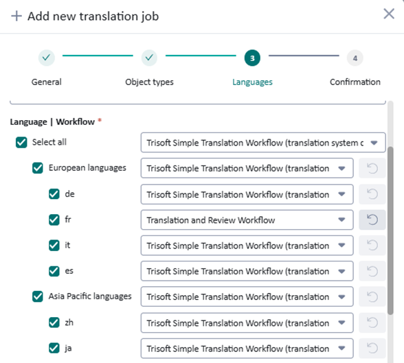 Customers were asking for the possibility of configuring language groups. New functionality was added to simplify configuration for a new Translation Job by allowing the selection of translation workflow per language group (European languages, Asia Pacific, etc) that also minimizes misconfiguration.