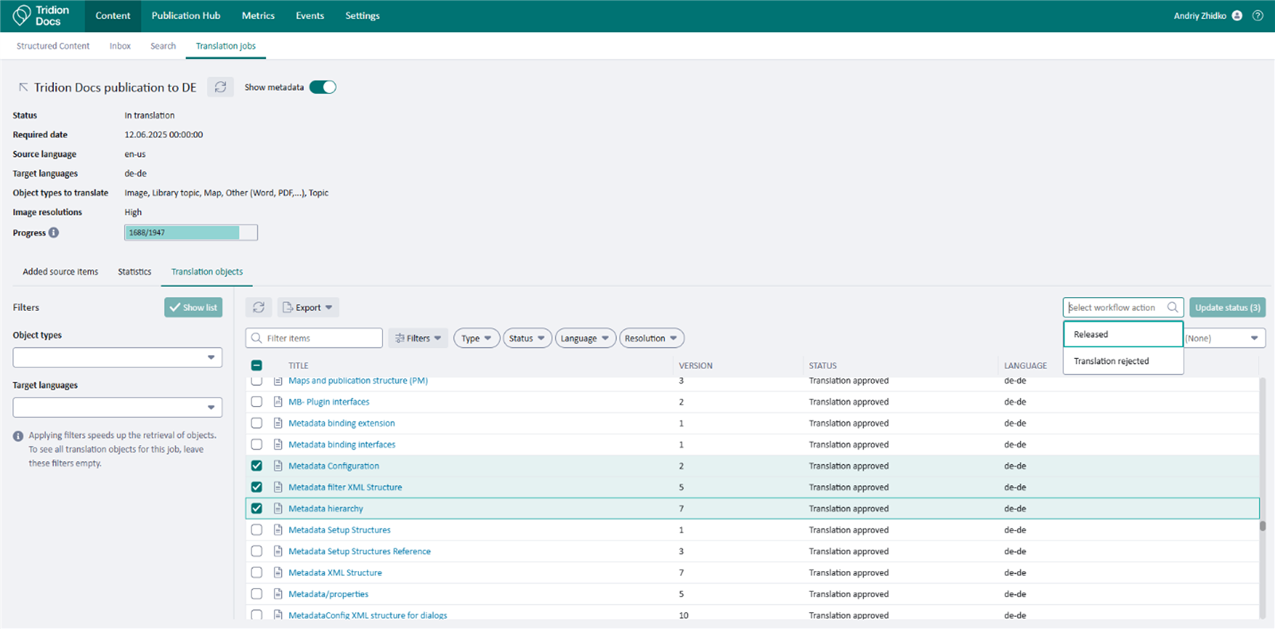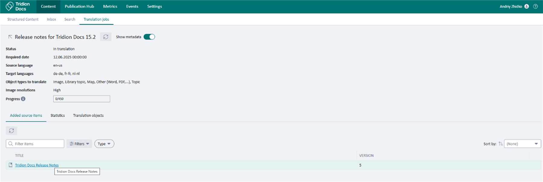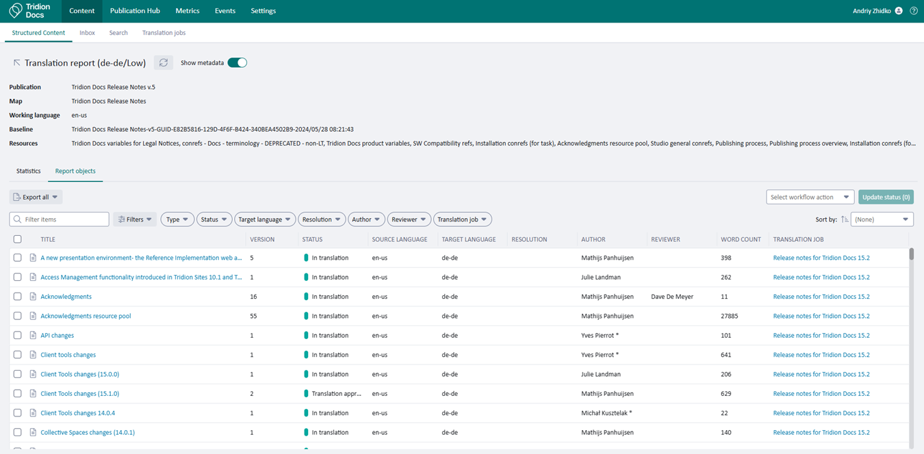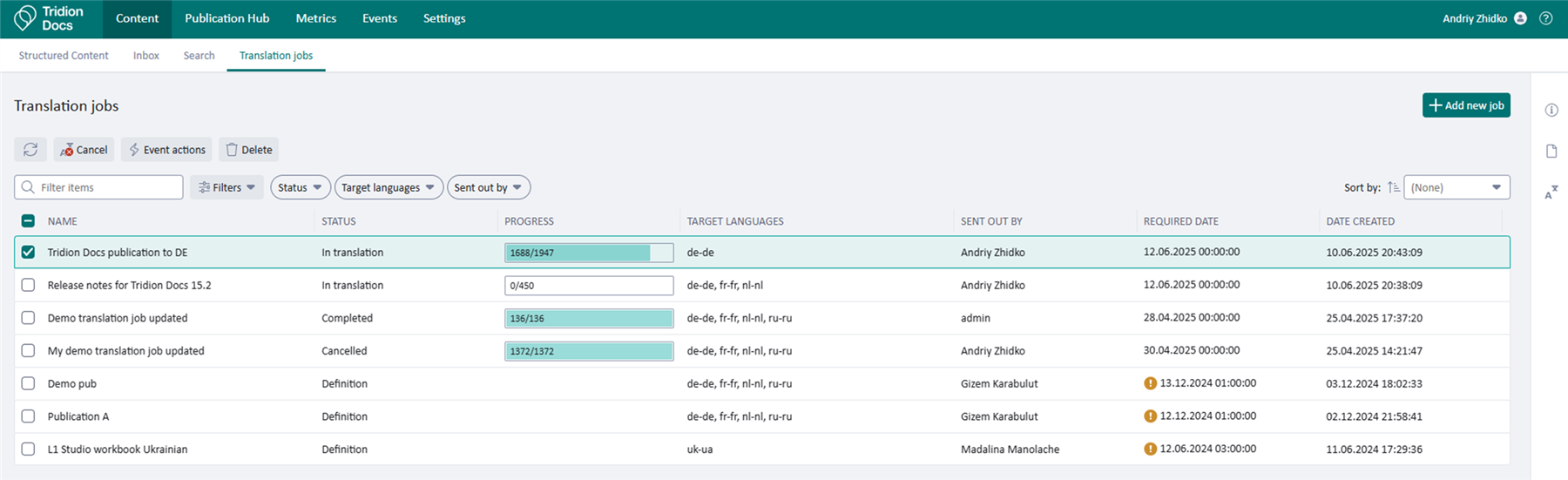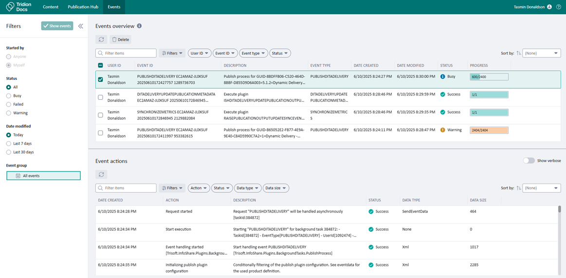 Tridion Docs 15.2 provides regular users with the possibility to see the current progress of their actions, like Translate or Publish, and gives an option to see the history of events with additional metadata. This also helps Tridion Docs Administrators by removing a dependency on them.