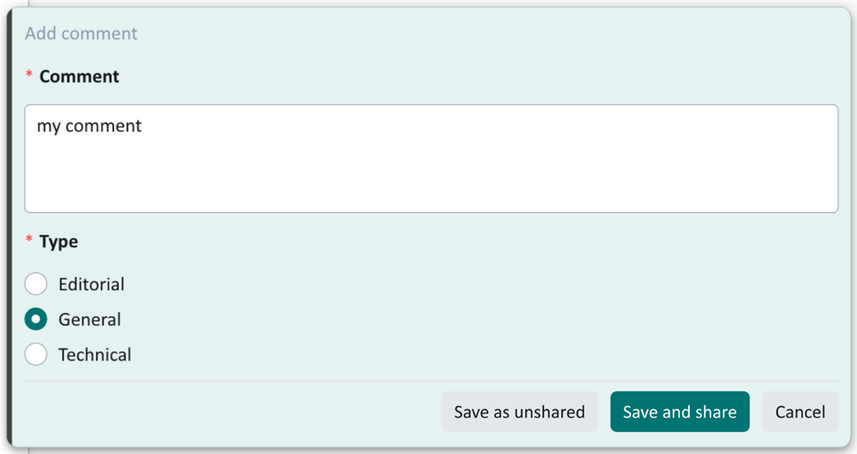 We adjusted labels in the “Add new comment” and “Add suggestion” dialogs and made “Save and share” the primary selection. This is done to prevent users from unsharing their comments by mistakenly clicking the Save button, which was a default selection before.