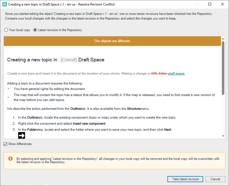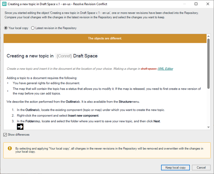 Starting with Tridion Docs 15.2, Client Tools detect that the item is not checked out anymore and ask the user which version should be used, the latest saved or the local one. The “Show the difference” option that is available helps the user to make the decision.