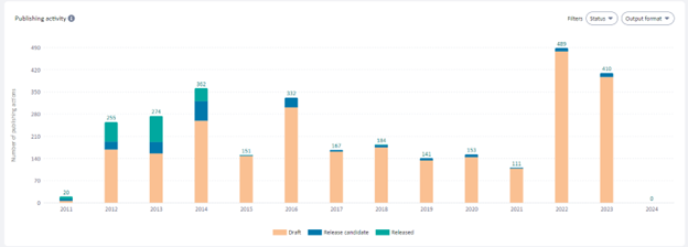 The publishing activity chart shows publishing activity for a selected period indicating the status of published outputs. Publishing activity can give you an overview of outputs per product and their status. This data helps to see teams focus as well as understand how efficiently they are delivering.