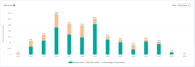 The topic reuse chart shows your reuse level for a selected period highlighting the amount of new content compared to the content that was reused. It also shows the reuse level on top of the column. Data from the chart helps to drive content reuse programs. For example, Metrics can show your reuse level for product release that was developed and delivered last quarter, based on which, you can decide if you should invest more in content reuse or if numbers meet expectations.