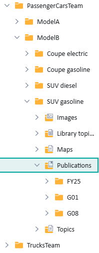 From this structure, all publications under ModelB should be tagged with the appropriate value “ModelB” for the product family field and, the same for the ModelA folder that should apply the “ModelA” tag. Similar actions are required for the TrucksTeam department and their product families.