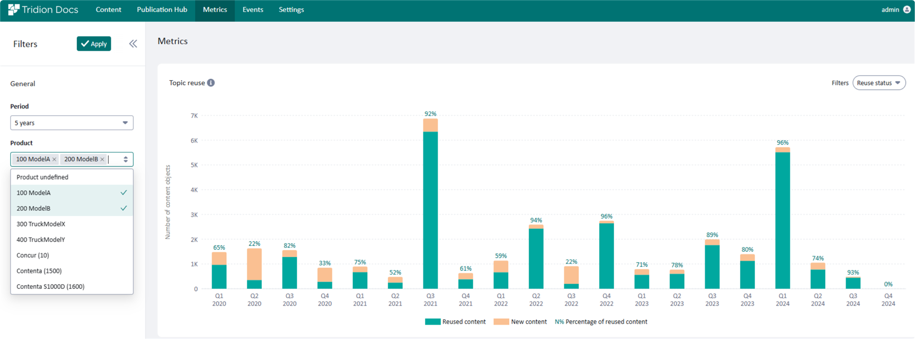 Tridion Docs Metrics gives you the option to zoom-in on your data using the Product filter.