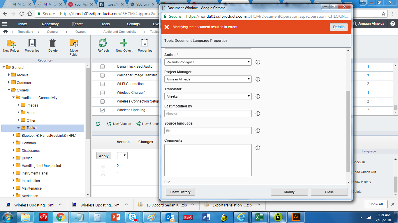 We tried to then upload just one XML to the FR language version of the object and received the same message. Nothing in the tags have been changed from when we initiated the translation process from the system itself in Content Manager - Selecting the Released Publication at the language level, selecting the "Translation" button, and "Generating the Target Language" of FR for all the non-publication objects.