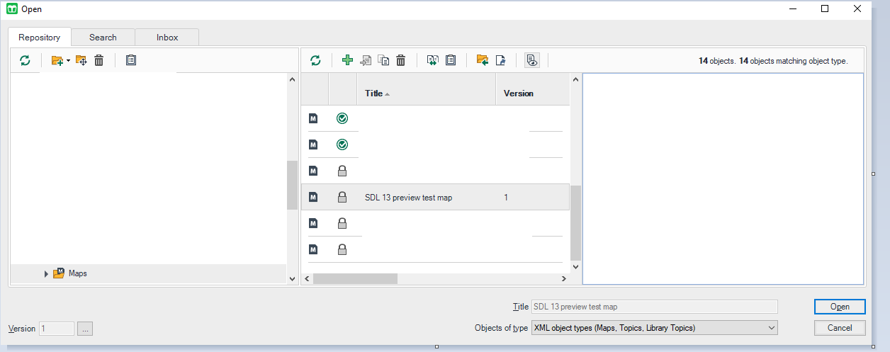 Screenshot of Trados Studio's XMetaL interface showing the Browse Repository option with a map selected and a preview pane open, but no XML preview displayed.